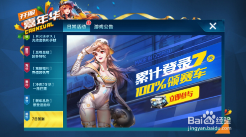 补签时脚色需要拥有点券,7日签到就能获取最终赛车体验宝箱。
