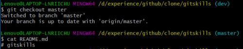 接下来我们利用“git checkout master“号令来切换分支,从当前的dev分支切换到master分支上去,然后我们利用“cat README.md”号令来查看一下master分支下的README.md文件内容,发现master分支下的文件内容并没有改变,如下图: