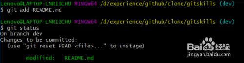 然后我们利用“git status”号令来查看版本库状况,号令窗口会告诉我们此刻我们在dev分支上,然后README.md文件进行了点窜,如下图:
