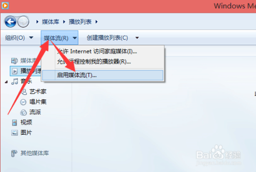 2、打开Windows media player,然后点击“媒体流”选项,并选择“启用媒体流”。