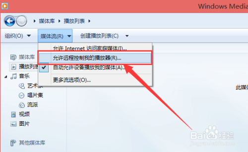 4、回到适才打开Windows media player的页面,此次我们再点击媒体流,并选择此中的第二个,也就是“许可长途节制我的播放器”。