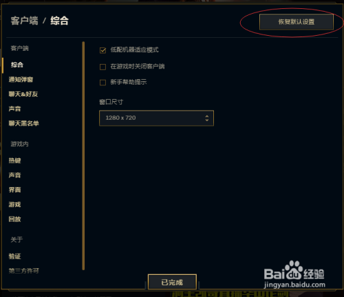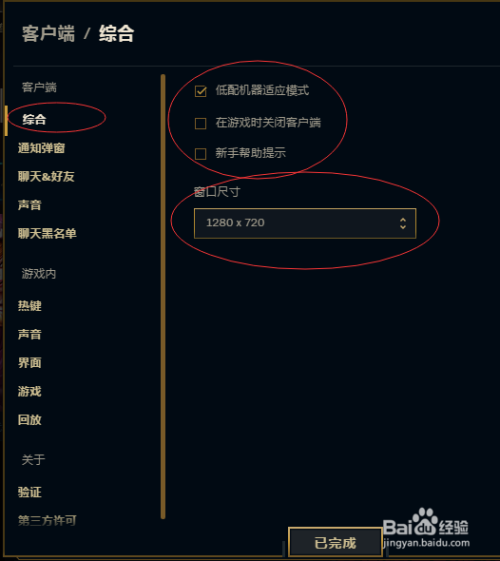 我们进入之后首先设置的是客户端的属性,‘综合’的可设置就如红圈内的。小编就感受‘低配机械顺应模式’对于小编这种用贫民仍是很有爱的;‘窗口尺寸’对于用笔记本电脑的玩家,也是不错的;