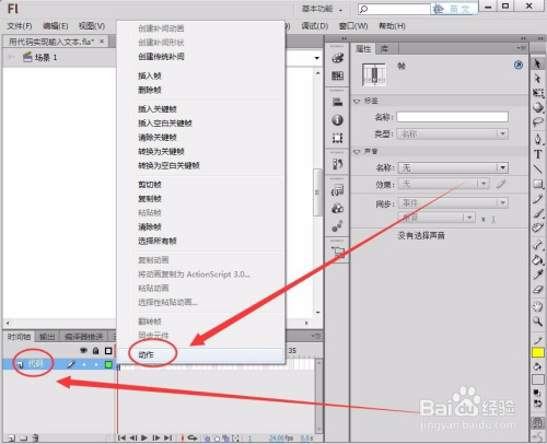 将图层1重定名为代码图层,在图层的第1帧右击,打开动作面板。