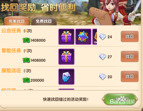 我们天天若是有没有完当作使命和副本的处所,我们第二天可以找回经验,并且经验很是的多,根基上可以让我们晋升当前品级,可是后期仍是有难度的。经由过程钻石可以完美找回更多的经验,如图所示。