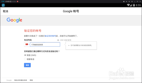 填完手机号码后点下一步,就立即呈现验证码填充框了!申明安卓模拟器是可以让手机号码验证的!