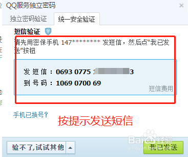 弹出小窗口"QQ办事自力密码验证体例“界面,因为密码健忘了,毫无疑问选择“同一平安验证”,按照提醒发送短信当作功后,点击“我已发送”