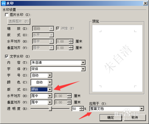 点击“插入水印”,在弹出的“水印”编纂框内,选定“文字水印”,我们可以编纂水印的内容、版式、字体、字号等内容。