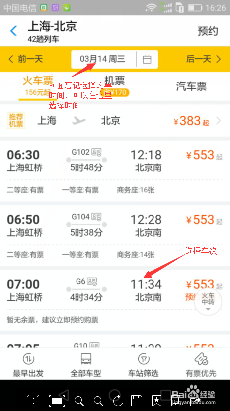 第三步,此刻进入选择那一趟车次页面了,你只要选择好要出行日期,时候,车次,然后点击进去就可以到下一步了。