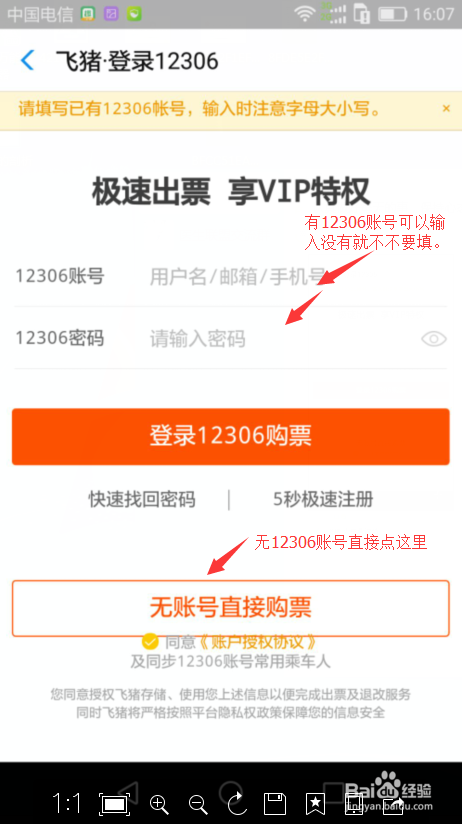第五步,到了这个页面,良多人就不会来了,页面让你登录12306账号在购票,这个时辰不消管它,直接点下方的无账号直接购票。当然你有账号可以登录后再买。
