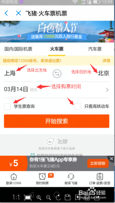 第二部,点开仗车票机票页面今后,就可鄙人方的选项中选择出发地到目标地了,选择好了下面还有两个选项,(1)学生票选项,(2)只看高铁动车。若是你是学生不要健忘学生票选项,那样可以打折啊。全数选择好了点起头搜刮。