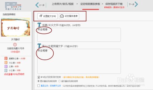 添加结从头至尾语和竣事语,可以设定整个相册的文字大小与播放速度。