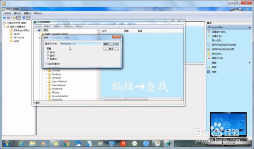 先点击计较机(为的是从头起头查找,因为注册表有记忆功能),然后输入关头词:360SuperKiller →查找下一个。