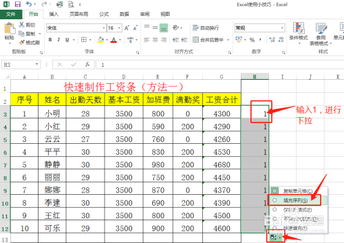 右侧空白处将输入序号“1”,进行下拉后,右击右下角方框,单击填充序列