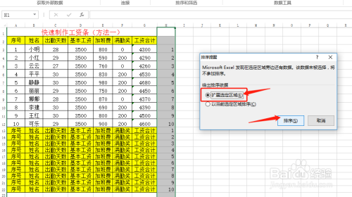 在弹出的对话框中选择“扩展选定区域”,单击“升序”