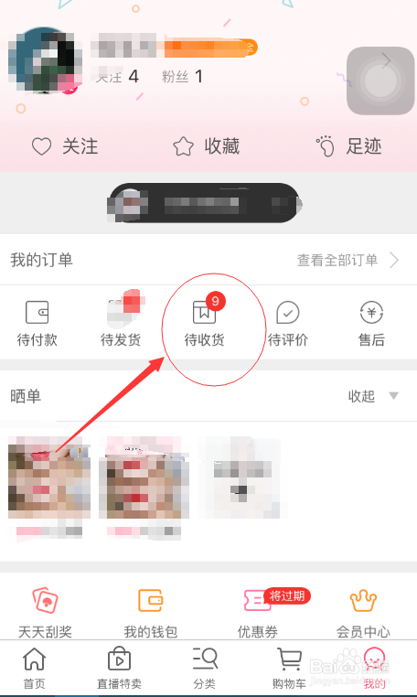 在蘑菇街首页点击我的按钮,选择待收货按钮。