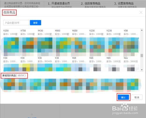 选择本身想要保举的商品,最多可选择10个。在详情页里面一排可显示8个商品,那起码也要选择8个,如许会比力都雅一些。