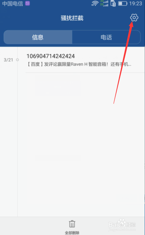 3,进入骚扰阻挡页面点击右上角的设置按钮。
