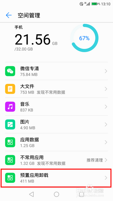 接着,在空间办理页面点击进入“预置应用卸载”。