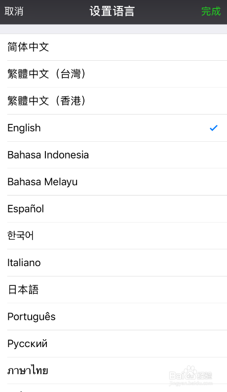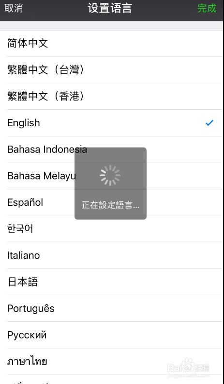 在设置说话界面默认为简体中文,点击English选项。点击设置说话窗口右上角的完成按钮,弹出正在设定说话。