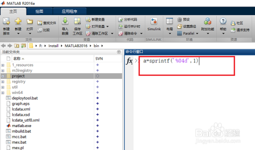 第一步在号令行窗口中输入“a=sprintf('%04d',1)”,如下图所示: