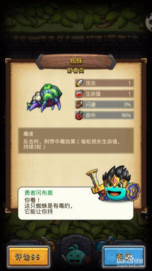 所有怪物都有特异功能,呈现毒蜘蛛,长按毒蜘蛛会呈现对话框,奉告这个怪物的相关技术