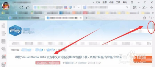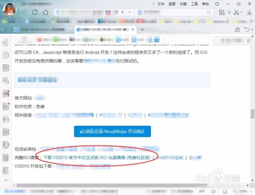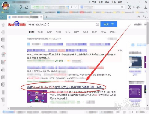 在百度搜刮页面中,找到“微软Visual Studio 2015 官方中文正式版完整ISO镜像下载”链接,点击进入。