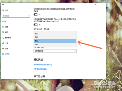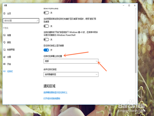 2.这时我们会看到使命栏选项中的“使命栏在屏幕上的位置”字样,点击方框右端的下拉按钮;