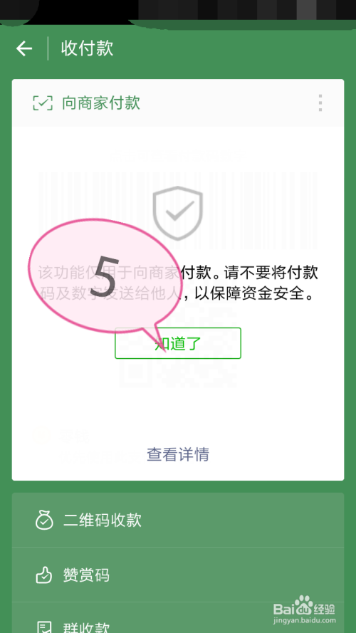 进入“收付条目”页面,点击“知道了”,进入条形码和二维码页面