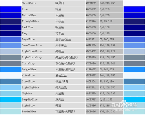 蓝色以及相关色的颜色名、中文名称、html代码、十进制代码。
