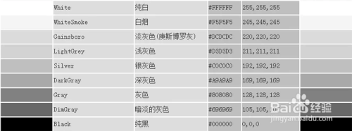 黑、白色以及相关色的颜色名、中文名称、html代码、十进制代码。