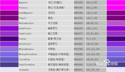 紫色以及相关色的颜色名、中文名称、html代码、十进制代码。