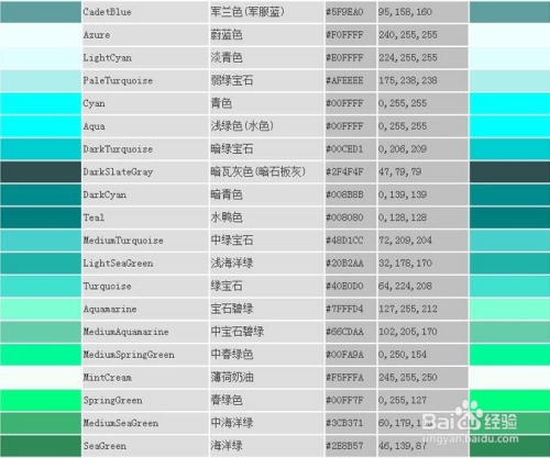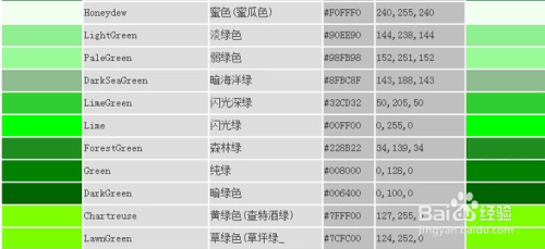 绿色以及相关色的颜色名、中文名称、html代码、十进制代码。