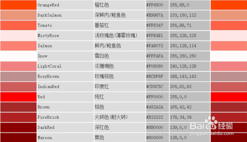 红色以及相关色的颜色名、中文名称、html代码、十进制代码。