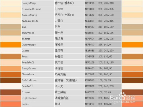 棕黄色以及相关色的颜色名、中文名称、html代码、十进制代码。