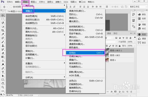 点击 图像 ——调整 —— 反相,或者按快捷键 Ctrl + I ,就半斤八两于口角倒置