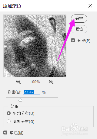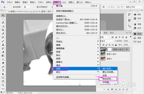 要呈现素描的笔触,还需要给图层添加滤镜,先给加上杂色滤镜,点击 滤镜 ——杂色 ——添加杂色,调整合适的值,确定