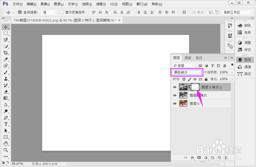选中蒙版,如图。将夹杂模式选择为颜色减淡