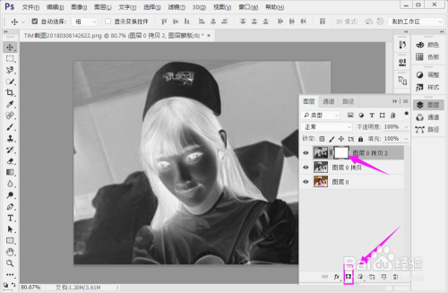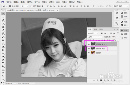 先Ctrl + J 复制一个图层,再按shift + Ctrl + U去色(或者点击图像 —— 调整 ——去色),按Ctrl +J 复制图层2