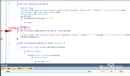 按键F9设置断点,设置断点便于法式调试,这个技术要把握。只需在想设置断点的处所单击一下再按F9 。