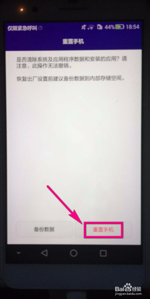 点击恢复出厂设置今后,页面会图示若是进行该项操作,你存储的一些账号信息就会被删除。所以在格局化手机之前,将手机上存储的主要资料拷贝出来。点击页面下方的【重置手机】。