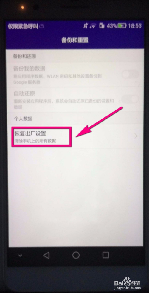进入到备份和重置页面后,在页面上找到并点击【恢复出厂设置】。