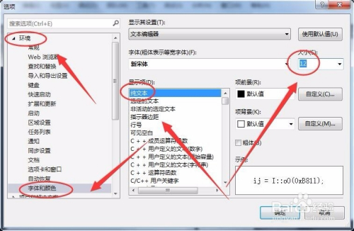 “选项”对话框中,找到“情况”---->“字体和颜色”,设置字体为“纯文本”,字体大小为12号。