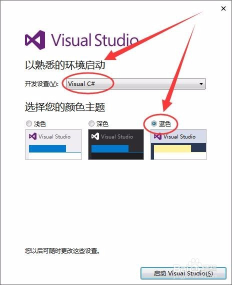 “开辟设置”后选择适合本身的开辟说话,本人选择“Visual C#”,单击“启动Visual Studio”按钮。