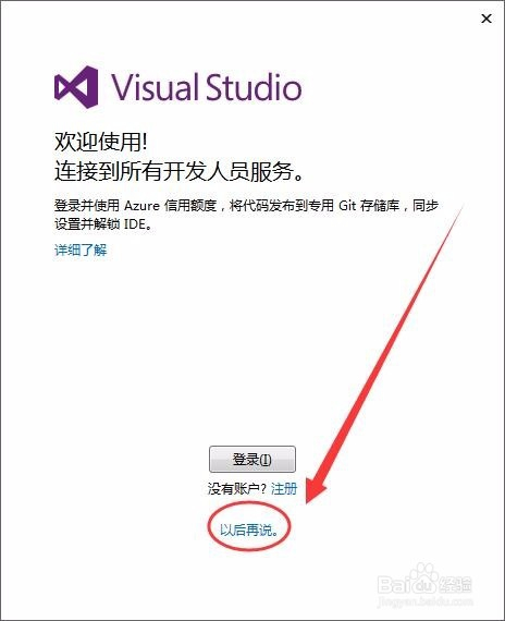 第一次打开Visual Studio2015,电脑会要求用微软的Outlook帐号登录,我们选择“今后再说”,不进行登录。