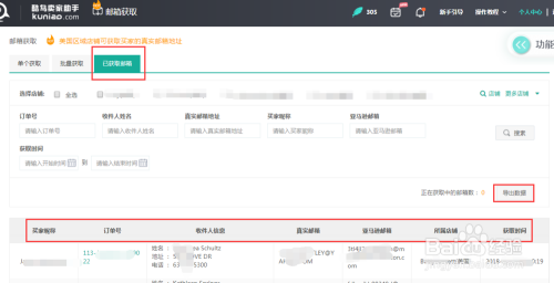 可筛选订单号、收件人姓名、买家昵称、下单时候后进行获取邮箱。