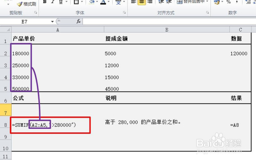 阐发:“产物单价高于280000”这个前提值位于A列的单位格中,提当作金额的数据位于B列的单位格。