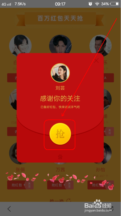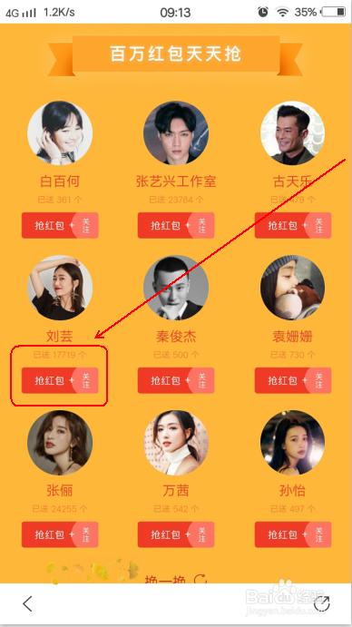 进入后,点击“抢红包+存眷”(天天可以抢6个红包)。