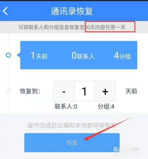 最后,若是想进行恢复,在界面中,最下方为此功能,点击,可调成天数,使手机联系人回到某一天的状况,如许即可恢复。