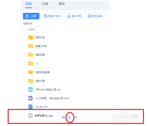 若是是在本身的云盘里,登录本身的云盘,然后找到会声会影的安装文件,把鼠标移到上面,就会有“分享”和“下载”两个图标,点击“下载”图标按要求去下载就可以了。若是是另人分享的云文件,若设置有密码还需要输入密码去下载。