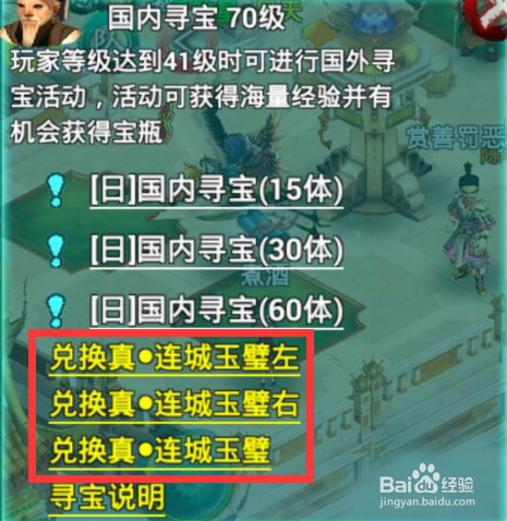 这时背包里会有个道具【真*连城玉璧右】或者【真*连城玉璧左】。然后回到王城,找的npc国内寻宝兑换【真*连城玉璧右】可以获得年夜量经验。或者和伴侣互换当作整个的【真*连城玉璧】,然后兑换。经验会翻一倍
